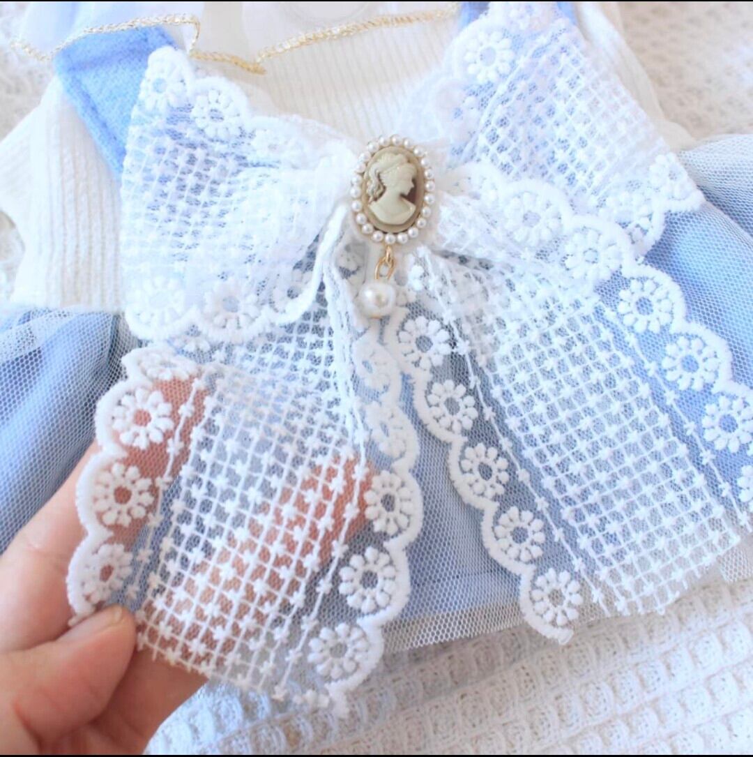 白のタートルニットにジャンパースカートを重ね着したデザインが特徴的で、優雅さと可愛らしさを兼ね備えています。大きなレースのリボンが華やかさを演出し、アクセントとしても抜群の存在感を放ちます。どんなシーンでも着こなせるアイテムです。